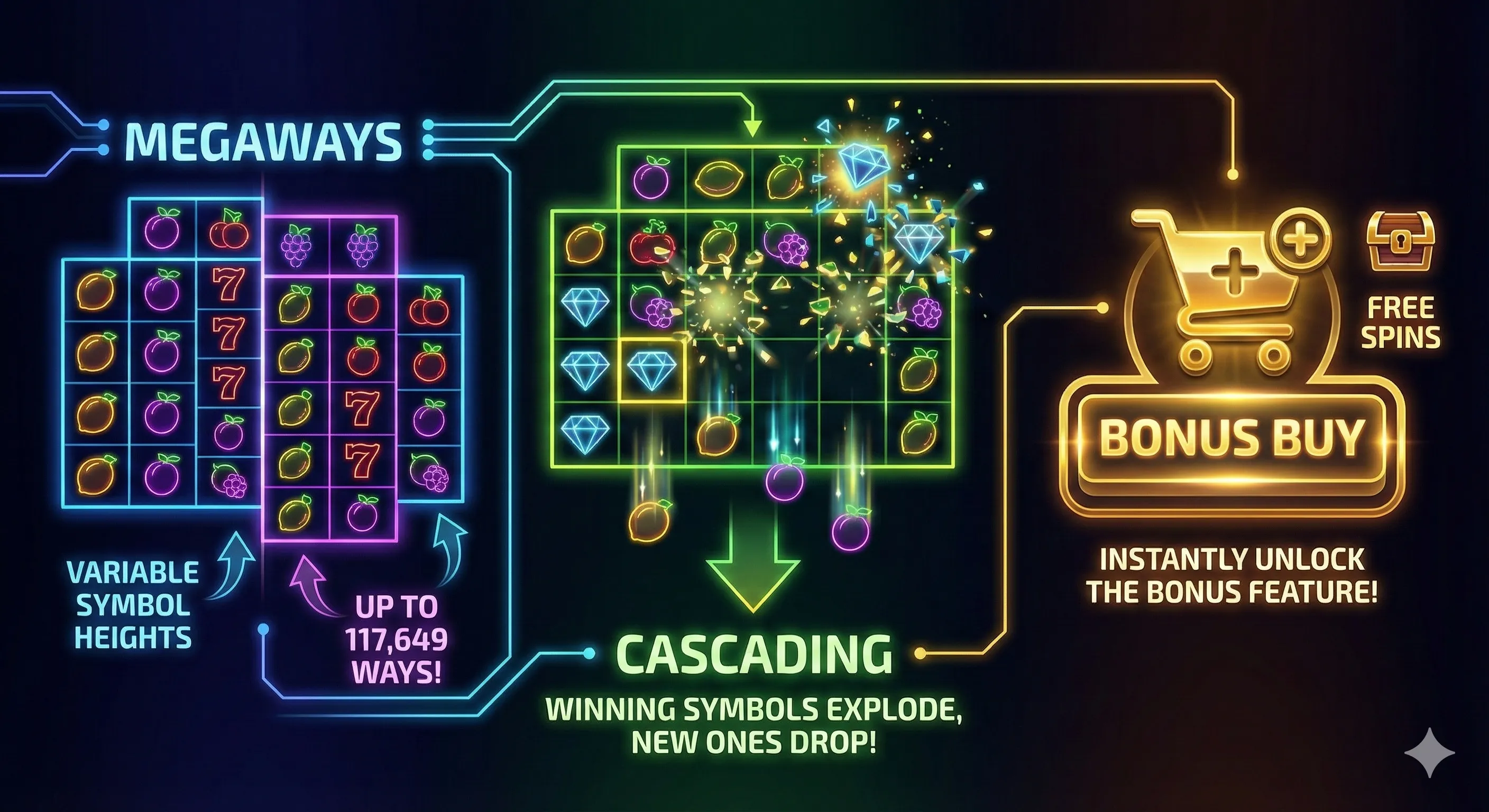 단순히 가로세로 줄을 맞추던 시대는 지났습니다. 최근 슬롯들은 플레이어에게 끊임없는 역동성을 제공합니다. 메가웨이즈 (Megaways): 기존의 고정된 페이라인을 파괴했습니다. 스핀마다 심볼의 개수가 변하며, 최대 117,649가지의 당첨 경로를 만들어냅니다. 매 판이 예측 불가능한 스릴 그 자체죠. 캐스케이드 (Cascading/Tumble): 테트리스처럼 당첨된 심볼이 터져 사라지고, 그 빈자리를 새로운 심볼이 채웁니다. 한 번의 스핀으로 연쇄 폭발(콤보)이 일어나며 수익이 눈덩이처럼 불어나는 쾌감을 줍니다. 보너스 구매 (Bonus Buy): 지루한 일반 게임 구간을 스킵하고, 비용을 지불하여 즉시 프리스핀(보너스 라운드)에 진입하는 기능입니다. '시간이 돈'인 현대인들에게 가장 사랑받는 기능 중 하나입니다.