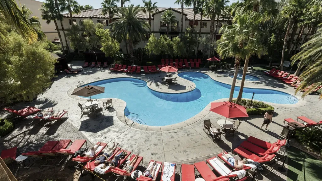 리조트 라이프의 핵심인 부대시설 역시 훌륭합니다. 야자수와 이탈리아풍 건축물로 둘러싸인 야외 수영장은 사막의 더위를 잊게 해주는 오아시스 같은 공간입니다. 따뜻한 햇살 아래 태닝을 즐기거나 랩 풀(Lap pool)에서 수영을 하며 여행의 피로를 씻어낼 수 있습니다. 또한 전문적인 스파 시설과 최신 운동기구를 갖춘 피트니스 센터가 마련되어 있어 웰니스 라이프를 실현하기에 부족함이 없습니다. 위치적으로도 스트립 주요 명소와 가까우면서도 혼잡함에서는 한 발짝 물러나 있어 접근성과 휴식의 밸런스가 완벽합니다. 비교적 저렴한 가격에 이 모든 시설을 누릴 수 있다는 '가성비'는 이곳을 다시 찾게 만드는 가장 큰 이유입니다.
