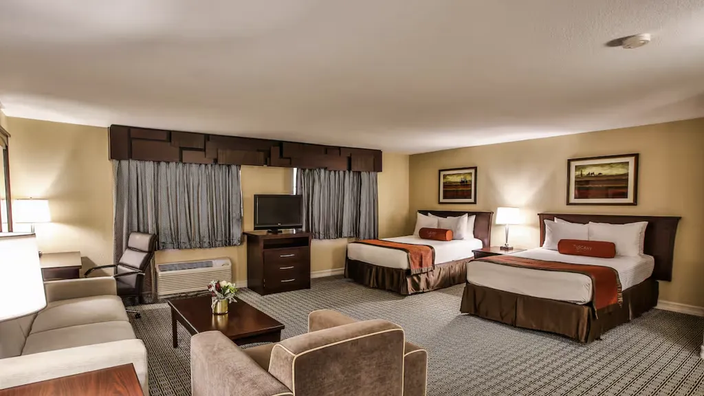 투스카니 스위트 & 카지노가 가진 최고의 경쟁력은 단연 객실 컨디션입니다. 이곳의 모든 객실은 침실과 거실이 분리된 넓은 스위트룸 형태로 설계되어 있어, 일반적인 라스베이거스 호텔 객실보다 훨씬 넉넉한 공간을 제공합니다. 앤티크 한 가구와 현대적인 편의 시설이 조화를 이룬 인테리어는 집과 같은 편안함을 줍니다. 무엇보다 가장 큰 특징은 숙박동과 카지노 건물이 물리적으로 분리되어 있다는 점입니다. 덕분에 투숙객들은 카지노 특유의 소음이나 담배 냄새로부터 완전히 해방되어 조용하고 쾌적한 환경에서 휴식을 취할 수 있습니다. 아름다운 정원 뷰를 감상하며 여유를 만끽할 수 있는 구조는 가족 단위 여행객이나 힐링을 원하는 분들에게 최상의 만족도를 제공합니다.