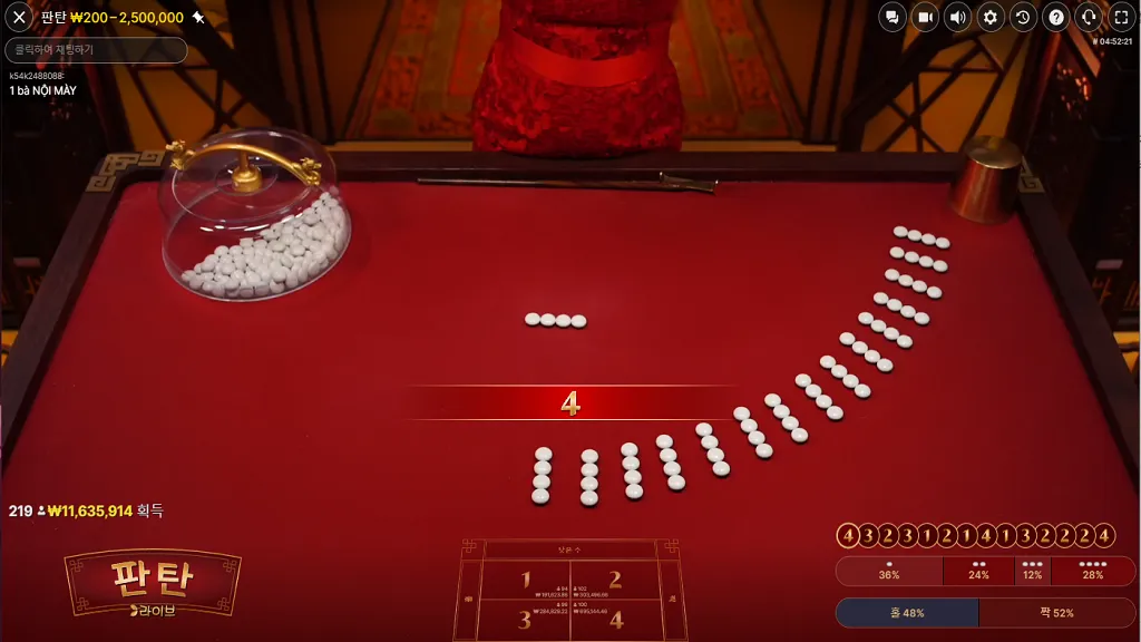 판탄은 19세기 중반 중국 상인들 사이에서 유행하던 전통 도박에서 유래했습니다. 초기에는 길거리나 시장에서 바둑알을 이용해 간단하게 즐기던 놀이였으나, 이후 마카오 등 아시아 전역의 카지노로 퍼지며 현대적인 형태를 갖추었습니다. 게임의 진행 방식은 시대를 초월하여 매우 단순합니다. 딜러가 테이블 중앙에 있는 수많은 흰색 구슬(바둑알) 무더기를 금속 컵으로 무작위로 덮어 분리합니다. 베팅 시간이 종료되면 덮어둔 컵을 열고, 특수하게 제작된 대나무 막대를 이용해 구슬을 정확히 '4개씩' 분리해 나갑니다. 이 과정을 반복하여 마지막에 남는 구슬의 개수(1, 2, 3, 4)가 최종 승리 숫자가 됩니다. 딜러의 손끝에서 4개씩 줄어드는 구슬을 지켜보는 과정은 판탄만이 가진 독보적인 스릴을 제공합니다.