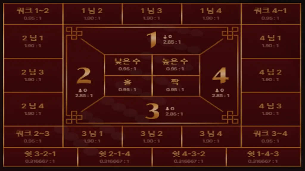 판탄의 매력은 직관적인 결과(1~4) 안에 다양한 베팅 옵션이 존재한다는 점입니다. 기본적으로 '단일 숫자 베팅(Fan)'은 1, 2, 3, 4 중 하나를 정확히 맞추는 것으로 2.85배의 배당을 받습니다. 승률 50%를 노리는 '홀/짝(Odd/Even)'과 '대/소(Big/Small)' 베팅은 0.95배의 배당이 주어집니다 (1, 2는 소 / 3, 4는 대). 더욱 정교한 플레이를 원한다면 고급 옵션을 활용할 수 있습니다. '님(Nim)'은 두 숫자를 선택하여 하나는 승리(1.90배), 하나는 무승부 처리하는 방어적 베팅입니다. '궉(Kwok)'은 두 숫자를 골라 어느 것이 나오든 승리(0.95배)하는 안정적인 방식이며, '쉿(Ssh)'은 세 개의 숫자를 선택해 적중 확률을 75%까지 끌어올리는 대신 0.316배의 낮은 배당을 제공합니다.