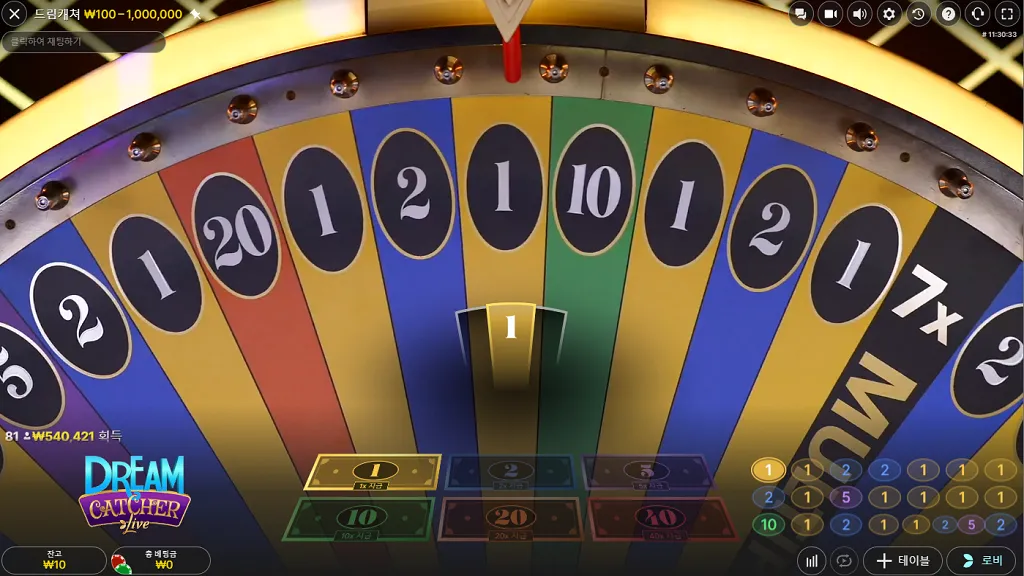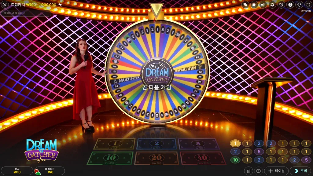 드림캐쳐의 핵심은 스튜디오 중앙에 위치한 거대한 수직 휠입니다. 이 휠은 총 54개의 섹션으로 나뉘어 있으며, 각 섹션에는 1, 2, 5, 10, 20, 40의 숫자와 두 개의 멀티플라이어(2x, 7x)가 배치되어 있습니다. 게임의 룰은 간단합니다. 플레이어는 휠이 멈출 것이라고 예상되는 숫자에 베팅하면 됩니다. 여기서 중요한 것은 '확률과 배당의 반비례 관계'입니다. 숫자 '1'은 휠에서 가장 많은 23개 구역을 차지하고 있어 당첨 확률이 높지만 배당은 1배에 불과합니다. 반면, 숫자 '40'은 단 1개 구역에만 존재하여 당첨 확률은 극히 낮지만, 성공 시 40배의 고수익을 안겨줍니다. 숫자 2(15개), 5(7개), 10(4개), 20(2개) 역시 각각의 구역 수에 따라 차등화된 배당을 제공합니다. 따라서 플레이어는 자신의 성향에 따라 '안정적인 1, 2 공략'과 '인생 역전 40 공략' 사이에서 전략적인 선택을 해야 합니다.