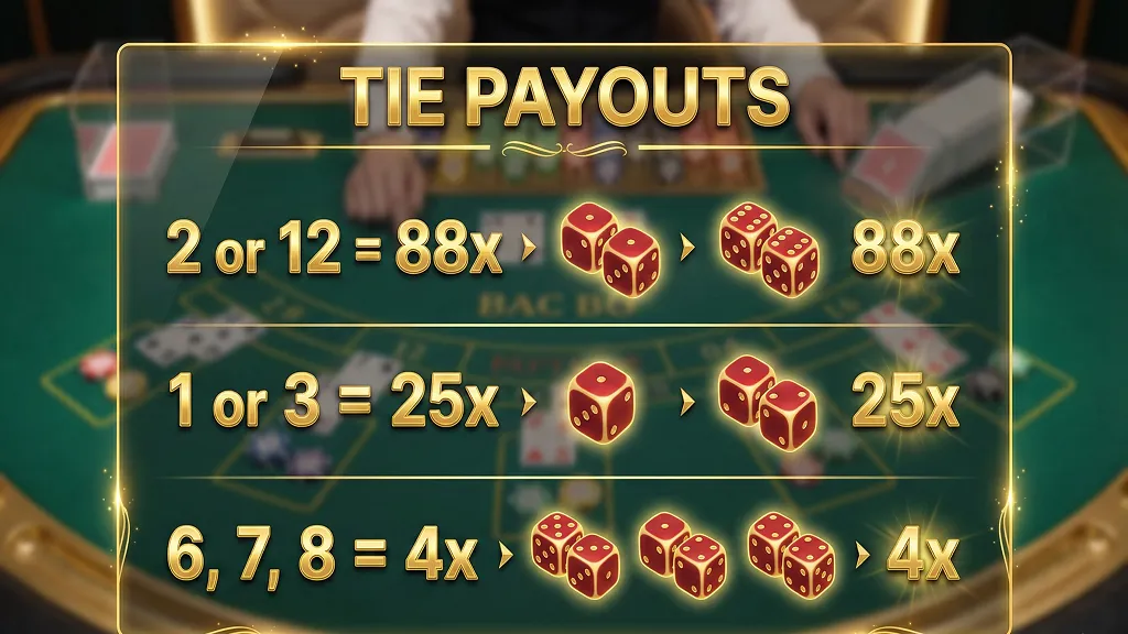 백보의 베팅 옵션은 플레이어, 뱅커, 그리고 타이(Tie)로 구성됩니다. 플레이어와 뱅커 승리 시 배당률은 1배(1:1)를 기본으로 하되, 본 가이드 기준으로는 승리 시 배당금의 90%가 지급되는 수수료(Commission) 규칙이 적용될 수 있습니다. 백보의 진정한 묘미는 바로 '타이 베팅'에 있습니다. 일반 바카라의 타이는 고정 배당이지만, 백보는 무승부가 된 주사위 합의 숫자에 따라 배당이 달라집니다. 가장 확률이 낮은 2 또는 12로 비길 경우 무려 88배의 잭팟이 터집니다. 1 또는 3은 25배, 4 또는 10은 10배 등 숫자에 따라 차등 지급되므로, 소액으로 고배당을 노리는 사이드 베팅의 재미가 쏠쏠합니다.