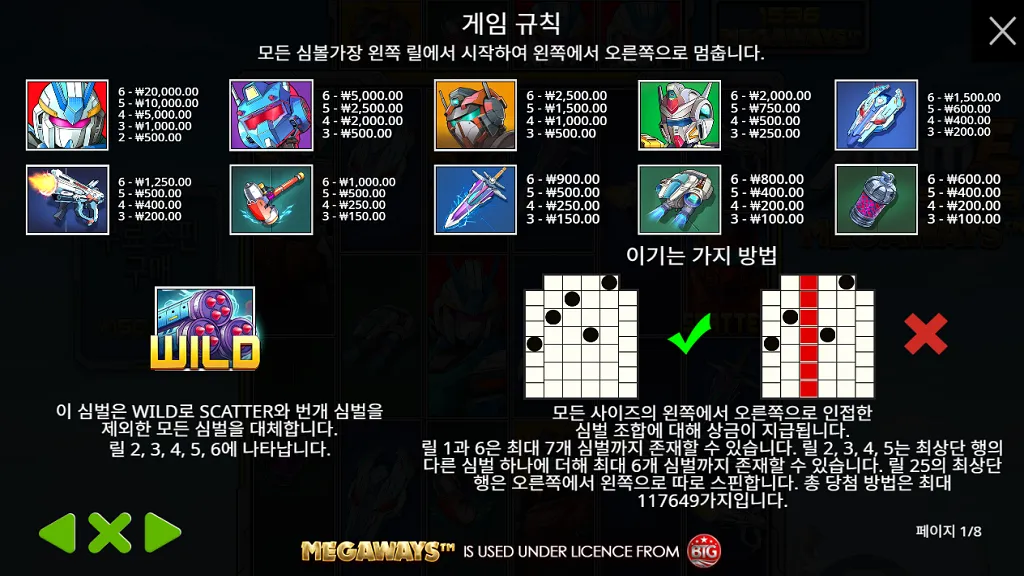 애니메 메카 메가웨이즈는 6개의 유동적인 릴 구조를 통해 매 스핀마다 새로운 승리 가능성을 열어줍니다. 각 릴에는 최소 2개에서 최대 7개의 심볼이 무작위로 등장하며, 이를 통해 구현되는 최대 117,649개의 페이라인은 일반 슬롯과는 비교할 수 없는 당첨 확률을 자랑합니다. 게임 내 상위 심볼인 메카 캐릭터와 무기 심볼들은 고배당의 핵심이며, 이를 보조하는 와일드 심볼은 스캐터를 제외한 모든 심볼을 대체하여 수익을 극대화합니다. 특히 '텀블 기능'이 적용되어 승리 조합이 완성될 때마다 해당 심볼이 파괴되고 새로운 심볼이 채워지며 단 한 번의 베팅으로도 연쇄적인 수익 창출이 가능합니다. 이러한 다이내믹한 전개는 한순간도 화면에서 눈을 뗄 수 없게 만드는 이 게임만의 전매특허입니다.