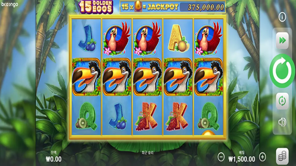 2017년 출시 이후 꾸준한 사랑을 받고 있는 부운고(Booongo)의 명작, '15 골든 에그(15 Golden Eggs)'를 소개합니다. 삭막한 도시를 떠나 푸른 야자수가 우거진 정글 속에서 펼쳐지는 보물 찾기를 테마로 한 이 게임은, 화려한 색감의 희귀 새들과 함께 황금알을 수집하는 여정을 그립니다. 직관적인 규칙과 귀여운 그래픽 뒤에 숨겨진 강력한 한 방, 잭팟의 기회가 살아 숨 쉬는 15 골든 에그의 매력 속으로 여러분을 초대합니다.