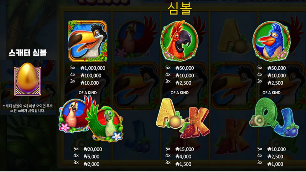 이 게임은 표준적인 5x3 릴 구조를 따르지만, 그 안의 메커니즘은 플레이어의 도전 욕구를 자극합니다. 총 10개의 심볼 중 5종류의 새 심볼과 4종류의 카드 심볼이 등장하며, 가장 중요한 것은 단연 '황금알' 스캐터입니다. 최소 베팅 120원부터 최대 39,000원까지 폭넓은 베팅 옵션을 제공하여 소액 유저와 하이롤러 모두를 만족시킵니다. 환수율(RTP)은 93.90%로 다소 낮게 느껴질 수 있으나, 이는 잭팟 터짐 시의 보상이 매우 크기 때문입니다. 전형적인 '하이 리스크, 하이 리턴' 게임으로, 잔잔하게 흐르다가도 한 번의 프리스핀 진입으로 베팅 금액의 수천 배에 달하는 수익을 올릴 수 있는 것이 특징입니다. 인내심을 가지고 황금알을 기다리는 전략이 필요합니다.