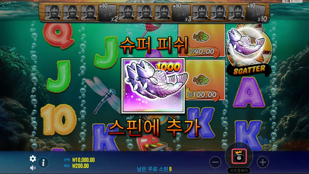 게임의 백미는 단연 진화된 프리 스핀 모드입니다. 베이스 게임 중 스캐터 심볼이 3개 이상 나타나면 프리 스핀 모드에 진입하며, 스캐터 개수에 따라 최대 20회의 무료 스핀을 획득합니다. 프리게임이 시작되면 '낚시꾼 와일드'가 등장하여 릴에 보이는 '물고기 상금 심볼'의 금액을 모두 수집합니다. 핵심은 와일드 누적 시스템에 있습니다. 낚시꾼 와일드를 4개 모을 때마다 추가 스핀 10회와 함께 승수(멀티플라이어)가 증가합니다. 승수는 2배에서 시작해 3배, 그리고 최대 10배까지 단계적으로 상승하며 총 3단계까지 진입 가능합니다. 이 단계적 상승 시스템은 플레이어에게 지속적인 기대감과 함께 폭발적인 당첨의 기회를 제공합니다.