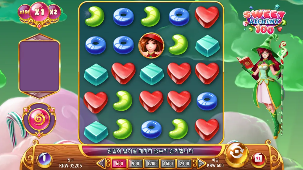 스위트 알케미 100은 일반적인 슬롯의 페이라인 개념을 과감히 삭제했습니다. 대신 5x5 그리드 안에서 동일한 심볼이 가로 또는 세로로 3개 이상 인접하기만 하면 당첨으로 인정됩니다. 승리한 심볼이 사라지면 그 자리에 '알사탕' 모양의 와일드 심볼이 생성되어 연쇄 당첨의 징검다리 역할을 합니다. 특히 주목할 점은 누적 멀티플라이어입니다. 연쇄 승리가 일어날 때마다 배당 승수가 1씩 증가하여 최대 100배까지 치솟습니다. 이는 기본 게임에서도 충분히 고배당을 노릴 수 있게 설계되었음을 의미하며, 화면의 심볼을 모두 제거할 경우 즉시 베팅 금액의 50배 보너스를 획득하는 파격적인 혜택도 포함되어 있습니다.