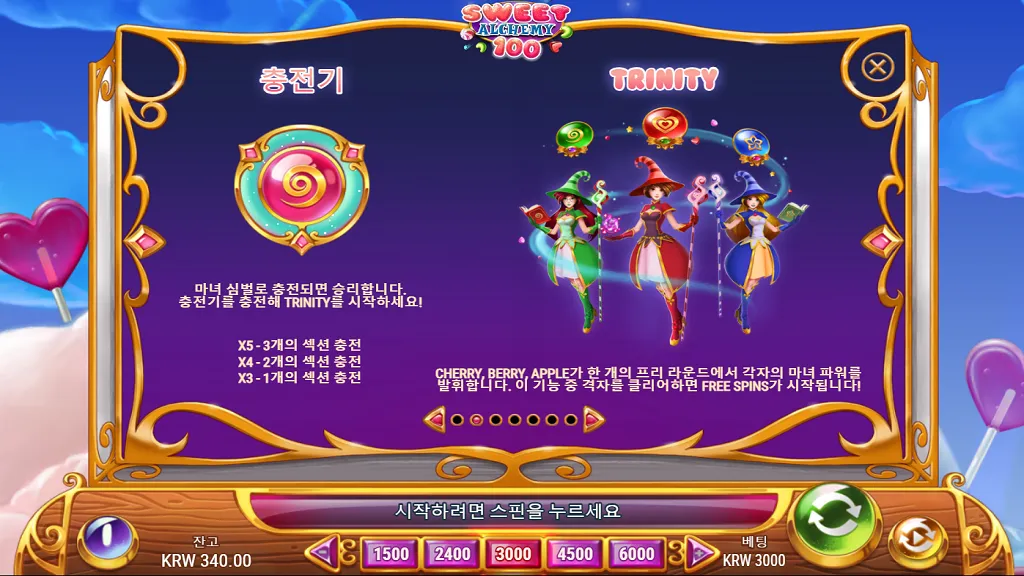 이 게임의 진정한 묘미는 체리(Cherry), 베리(Berry), 애플(Apple) 세 마녀가 선사하는 '위치 파워'에 있습니다. 수익이 발생하지 않은 스핀에서 무작위로 발동되는 이 기능은 전세를 단숨에 역전시킵니다. 체리는 특정 심볼 세트를 변환하고, 베리는 와일드를 추가하며, 애플은 불필요한 심볼들을 제거해 연쇄 반응을 유도합니다. 우측 하단의 충전 미터를 모두 채우면 발동되는 '트리니티(Trinity)' 모드에서는 세 마녀의 능력이 차례대로 발동되어 화면 전체를 청소할 기회를 제공합니다. 이 과정은 프리스핀으로 진입하기 위한 가장 핵심적인 관문이며, 플레이어에게 극적인 긴장감을 선사하는 핵심 요소입니다.