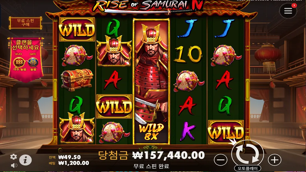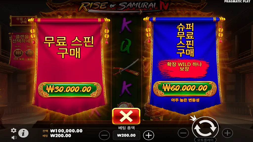스캐터 심볼 3개가 등장하면 10회의 무료 스핀이 주어지며, 이때부터 진정한 승부가 시작됩니다. 라이즈 오브 사무라이 4는 기다림이 지루한 플레이어를 위해 즉각적인 '보너스 구매' 기능을 제공합니다. 다테 모드는 베팅 금액의 75배, 사나다 모드는 150배를 지불하여 즉시 진입할 수 있습니다. 하지만 진정한 하이라이트는 베팅 금액의 300배를 지불하는 '슈퍼 무료 스핀'입니다. 이 기능을 활성화하면 10회의 무료 스핀과 함께 릴 1개를 꽉 채우는 '확장 와일드(Expanded Wild)'가 확정적으로 제공됩니다. 확장 와일드는 당첨 확률을 기하급수적으로 높여주며, 최대 당첨금 15,000배를 달성하는 데 결정적인 열쇠가 됩니다.
