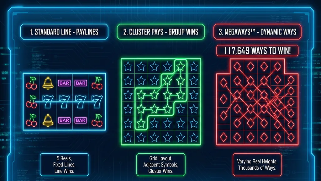 과거에는 가로 한 줄만 맞으면 되는 '1라인'이 전부였지만, 현대 슬롯의 승리 방식은 무궁무진합니다. 고정 페이라인: 10줄, 20줄 등 정해진 라인 위에 심볼이 나열되어야 합니다. 웨이즈 투 윈 (Ways to Win): 라인에 상관없이 왼쪽에서 오른쪽으로 인접한 릴에 동일 심볼이 나오면 당첨되는 방식으로, 243 웨이즈가 대표적입니다. 클러스터 페이 (Cluster Pays): 테트리스처럼 상하좌우로 인접한 심볼이 뭉치면 당첨되는 방식입니다. 메가웨이즈 (Megaways): 릴의 칸 수가 매 스핀마다 변하여 최대 117,649가지 이상의 당첨 경로를 만들어냅니다. 이러한 다양한 방식을 이해하면 게임의 재미가 배가됩니다.